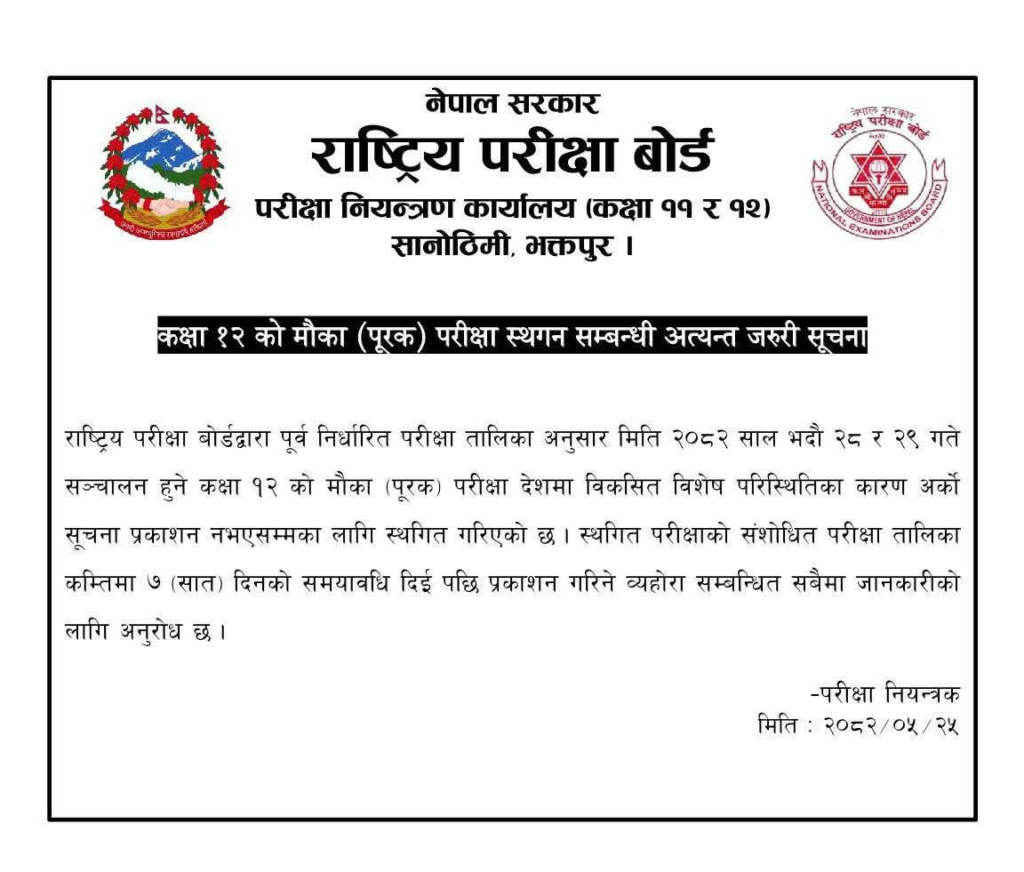 कक्षा १२ को मौका (पूरक) परीक्षा अनिश्चिकालसम्म स्थगित भएको छ। राष्ट्रिय परीक्षा बोर्डले बुधबार सूचना जारी गर्दै देशमा विकसित विशेष परिस्थितिका कारण अर्को सूचना प्रकाशन नभएसम्मका लागि स्थगित गरिएको जनाएको हो। कक्षा १२ को मौका परीक्षा भदौ २८ / २९ गते सञ्चालन हुने तालिका रहेको थियो।